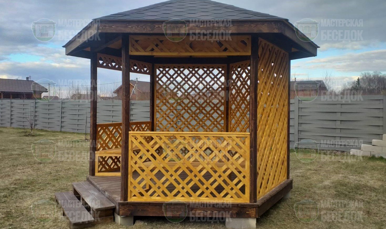 Деревянная беседка “Павлин” отличается от других беседок оригинальной формой декоративных пергол-решеток. Сдвоенные узкие рейки из сухой древесины камерной сушки придают особый шарм этой конструкции. На фотографиях беседка обработана бесцветной пропиткой класса Пинотекс, что защищает ее от атмосферных воздействий и одновременно подчеркивает натуральный цвет дерева.