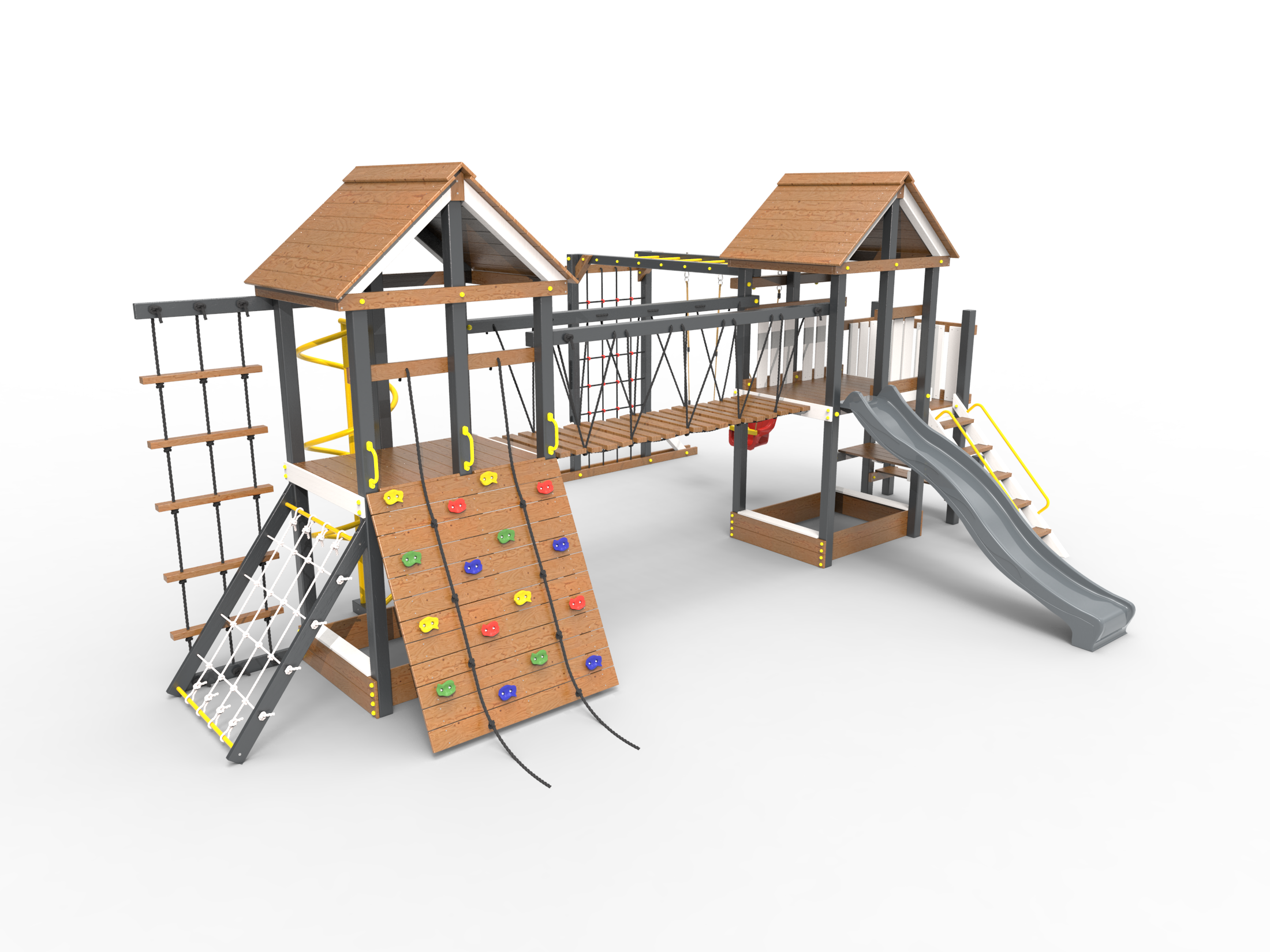 Обращаем Ваше внимание, что фактический цвет детской площадки может отличаться от представленных фото на сайте. Специфика окраски нетоксичными пропитками и красителями допускает отклонения в цветовой гамме отгружаемых изделий. Также обратите внимание, что фактический цвет может отличаться из-за цветопередачи устройства на котором Вы смотрите фото. Производитель оставляет за собой право менять цвет отдельных деталей и комплектующих(включая пластик, канаты и пр.), при этом сохраняя весь функционал и характеристики товара.